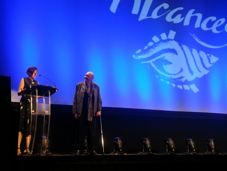 La artista sevillana recogió su galardón de manos del veterano cineasta Julio Diamante durante la gala de clausura de la muestra que tuvo lugar anoche en el Gran Teatro Falla de Cádiz. Con un discurso emocionado Cañas agradeció el reconocimiento y dedicó palabras de elogió a “Don Julio, un rebelde veterano”, quien recibió también el aplauso de cariño y respeto del público del Falla.