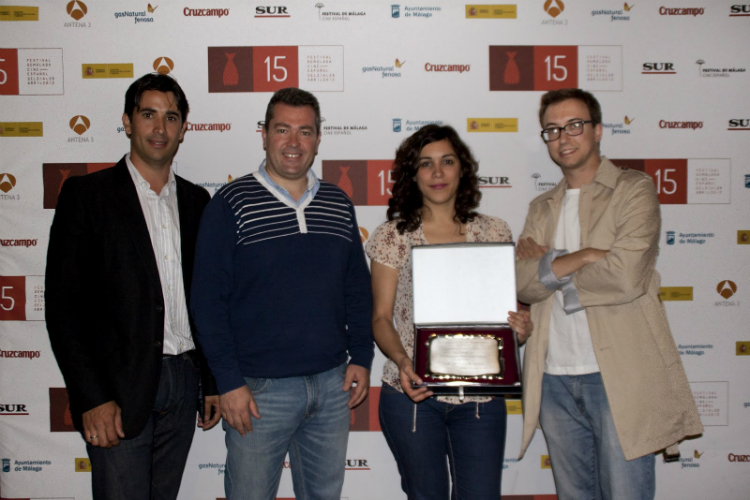 Fotografía de la entrega del Premio ASECAN Ópera Prima para Ali, película de Paco R. Baños, en el Festival de Málaga.